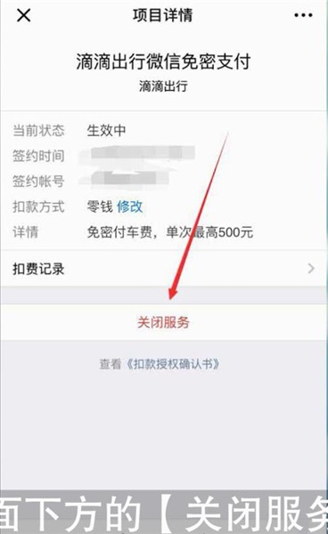 再点击进入【滴滴出行微信免密支付】页面,点击页面下方的【关闭服务】按钮,最后点击【关闭服务】选项即可。