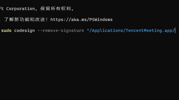 2、然后继续输入“sudo codesign --remove-signature "/Applications/TencentMeeting.app/"”删除签名。