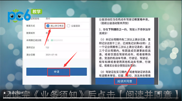 3.在学法减分界面选择【网上学习考试】,再点击【申请】;阅读完《业务须知》后点击【阅读并同意】。