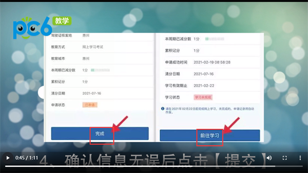 4.确认信息无误后点击【提交】,待审核通过后点击【学法减分】再点击【前往学习】即可。