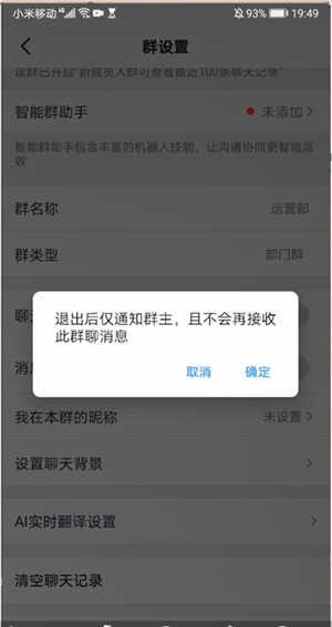 进入群聊页面之后点击右上角三点图标,滑动页面到底端再点击退出,然后再点击确定即可。