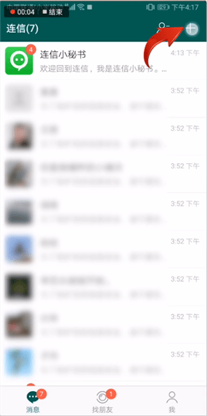 首先打开【连信】APP,然后点击右上角【+】图标;