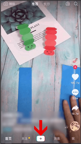 首先打开手机中的抖音APP,在首页中点击下方的加号拍摄按钮。