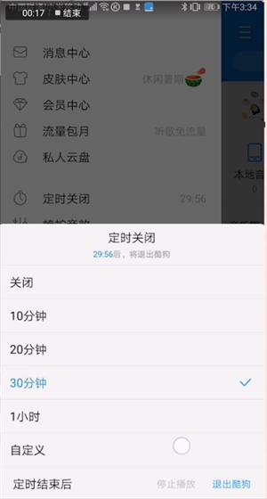 然后在打开的定时页面中,根据需要设置好时间,然后点击定时结束后,可以选择停止播放也可以是退出酷狗,设置好之后,点击返回,到时间它就会停止播放或者是退出了。
