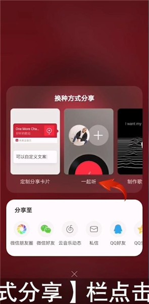 在【换种方式分享】栏点击【一起听】,最后选择分享方式和要一起听歌的好友即可。