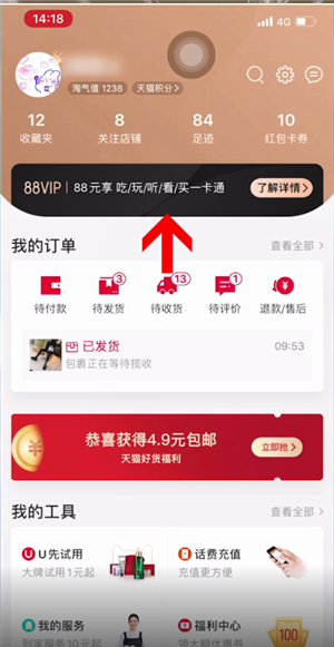 本期视频是由ios14.2版本的苹果11手机录制的,天猫版本是10.2.0。首先打开手机天猫app,点击“我”选项,在个人中心页面点击88vip,