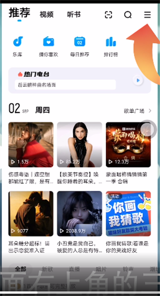 1.打开酷狗音乐APP,点击首页界面右上角的三横图标。