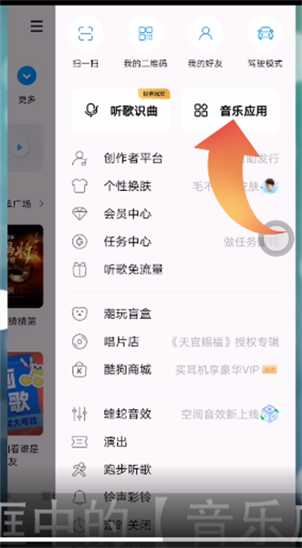 2.弹出功能框后,点击功能框中的【音乐应用】选项。
