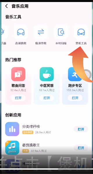 3.进入到音乐应用界面后,左滑【音乐工具】下的选项,找到并点击【煲机工具】。