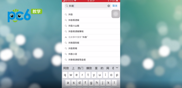 1.打开手机界面,单击打开App Store。单击搜索框,在其中输入抖音两个字,点击搜索框下拉的抖音选项。