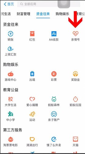打开支付宝,点击更多,在资金往来中选择亲情号,