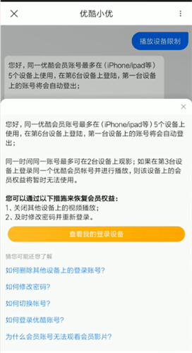 经询问官方客服,同一优酷会员账号最多在5个设备上使用哦,同一时间同一账号最多可在两台设备上观影。
