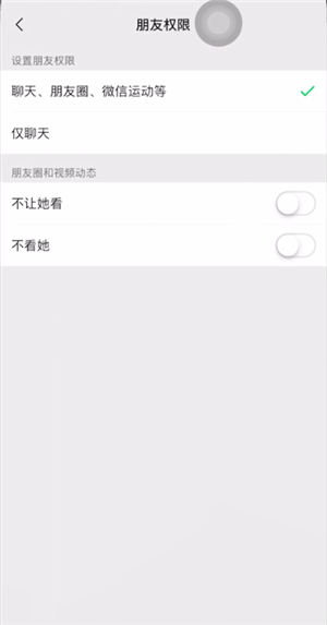 进入好友的个人页面之后点击右上角的设置图标,这时再点击朋友权限,可以选择聊天、朋友圈、微信运动等或仅聊天这两种功能,也可以开关不让他看和不看他功能。