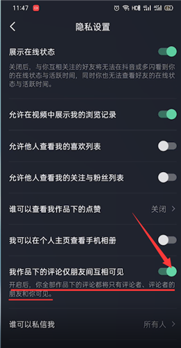 下面就有一个我作品下的评论仅朋友们互相可见,滑动右侧的滑块开启,开启后,你的全部作品下的评论都将只有评论者本人,评论者的朋友和你可见,不过这个功能并不是所有人都有的,在隐私设置上没有我作品下的评论仅朋友们互相可见就表明不能这样设置。