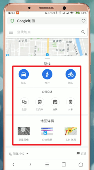 在谷歌地图中,用户可以查看自己的位置,也可以导航,在地图选择目的地,查看一些路线;
