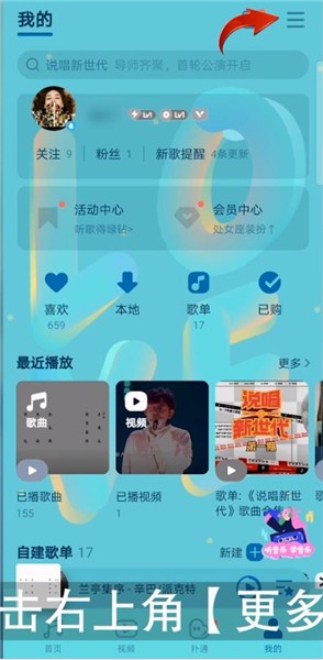 首先打开【QQ音乐】客户端,然后点击右下角【我的】图标,接着点击右上角【更多】图标,