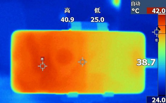 8、而且集中在上半部分,下半部分最高温度仅有38.7℃,说明它的游戏温度控制是不错的。