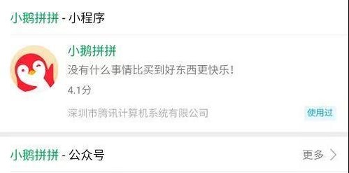 1、首先在微信搜索“小鹅拼拼”,关注该公众号,如下图所示;