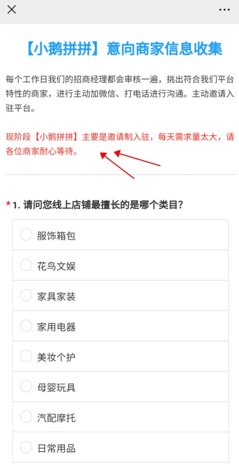 4、值得注意的是,目前“小鹅拼拼”输入邀请入驻,每天需求量很大,所有大家在填写问卷之后耐心等待就好了。