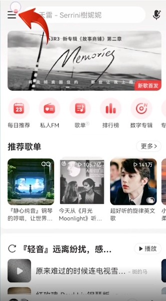 1、打开网易云音乐然后选择点击左上角三个横线打开隐藏菜单栏。