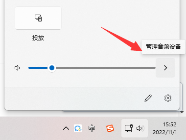 1、首先点击右下角“声音图标”,选择“管理音频设备”