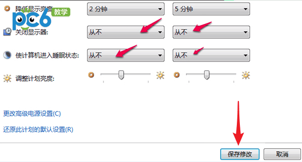 将【关闭显示器】和【使计算机进入睡眠状态】在用电池状态下选择和接通电源状态下选择【从不】;