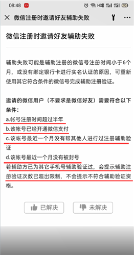 辅助失败可能是辅助注册的微信号注册时间小于6个月,可重新使用其它符合条件的微信号完成辅助注册验证。