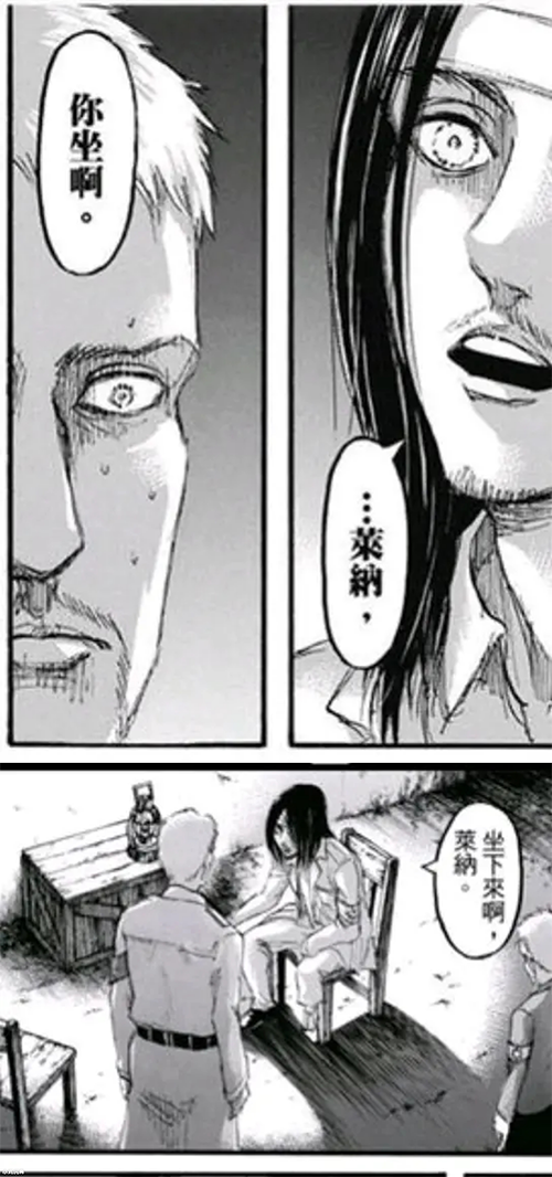 身为艾尔迪亚人的艾伦潜伏到马莱国,在对马莱开战之前和莱纳(曾经的战友,现在的敌人)进行了一次秘密会面,从而出现了这样的名场面。