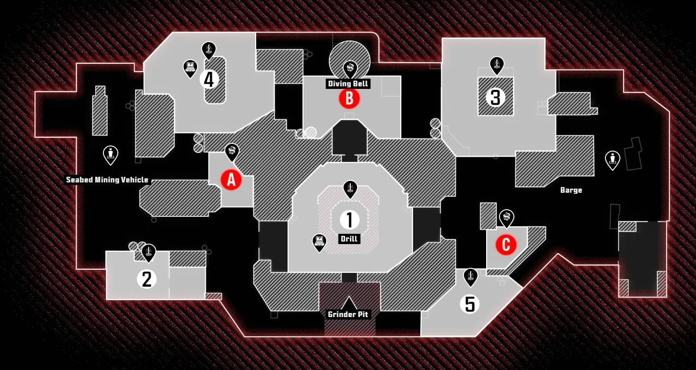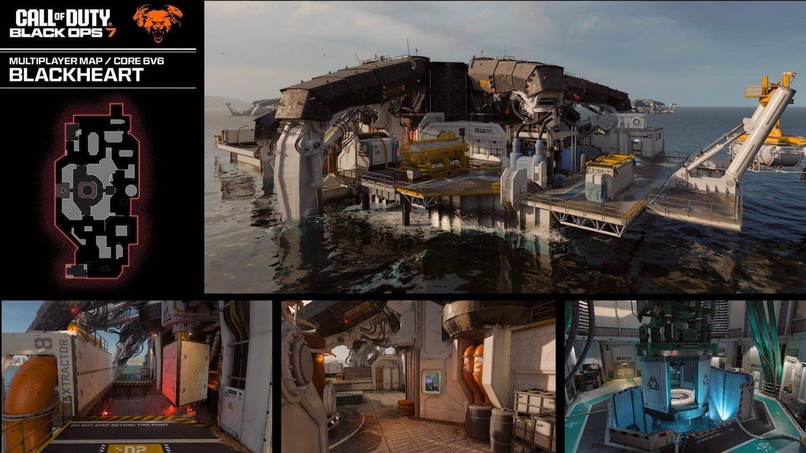 本篇为大家带来的是使命召唤黑色行动7的小型地图黑心地图的地图点位,这张图适用于6对6和2对2,战场设在公海上的“公会”钻井平台,玩家可在此开采海洋关键资源,战斗地点比较多,可以在中央钻塔周围展开激战,也能推进到装有矿物集装箱、泵站和巨型海上机械的驳船处作战。