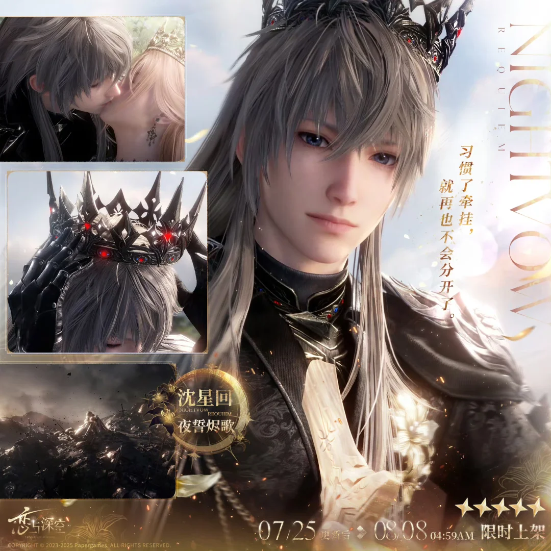 恋与深空即将开启沈星回单人活动,日卡2.0沉坠的冠冕五星套装思念为「沈星回·夜誓迷月」、「沈星回·夜誓烬歌」,解锁两张日卡可以解锁全新搭档身份「沈星回·暗蚀国王」,活动将在7月25日更新后开启,持续到8月8日。