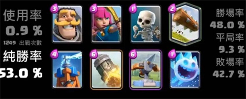1、卡组分析:一套比较新的X连弩卡组,使用率虽然不比经典连弩,但是胜率颇高,达到了53.0%。整套卡组防守能力很强,同时费用很低,可以进行速转,X连弩的输出频率不俗。整套卡组的缺陷在于防空能力,对于大群空间显然没有什么合适的应对手段。