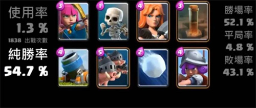 1、卡组分析卡牌的核心,是用来助攻偷塔的好帮手,但由于血量太低,所以需要进行卡牌搭配或出其不意的进攻,才能进行有效的爆炸性攻击。