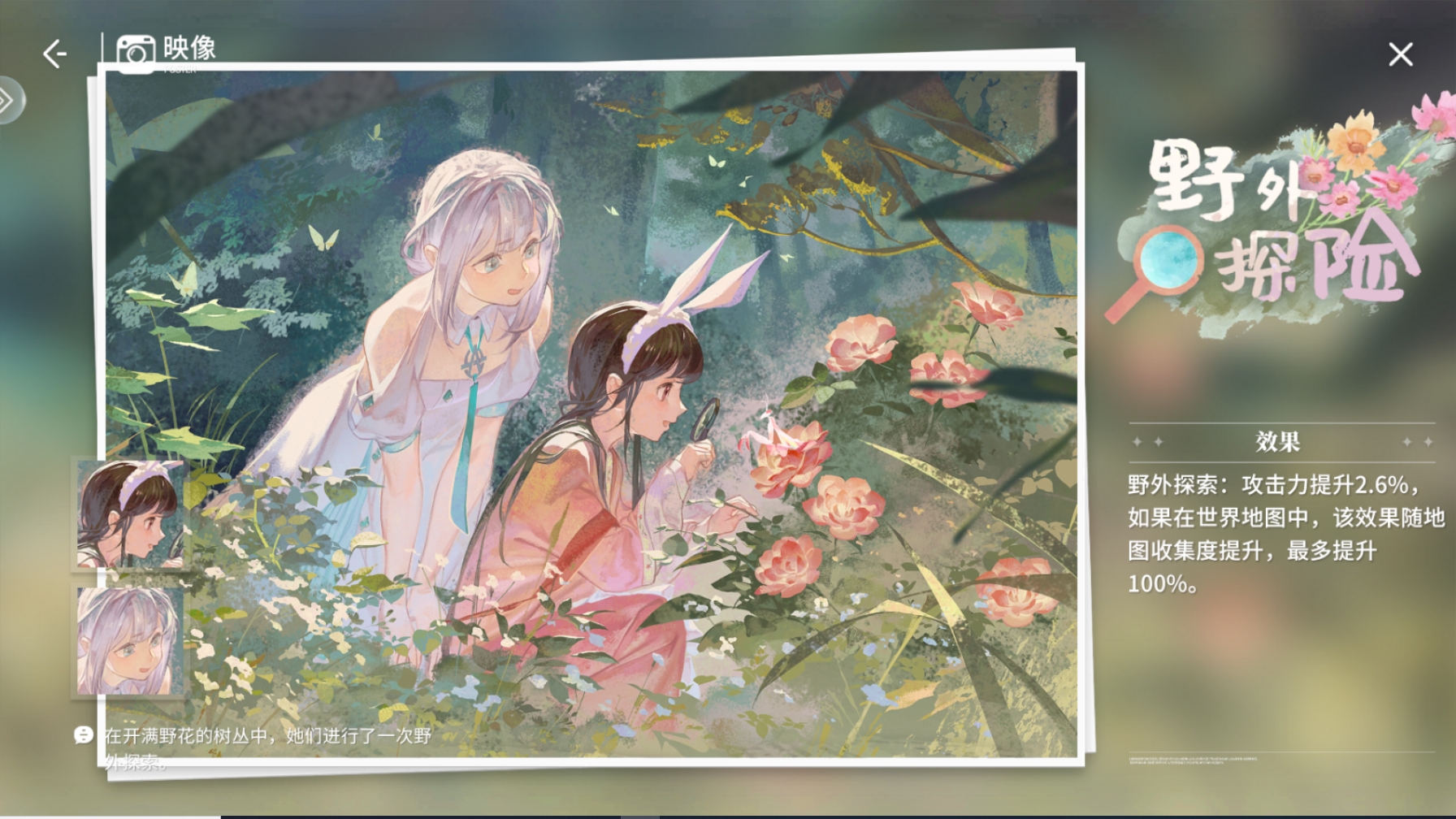 初级效果:攻击力提升2.6%,如果在世界地图中,该效果随地图收集度提升,最多提升100%。