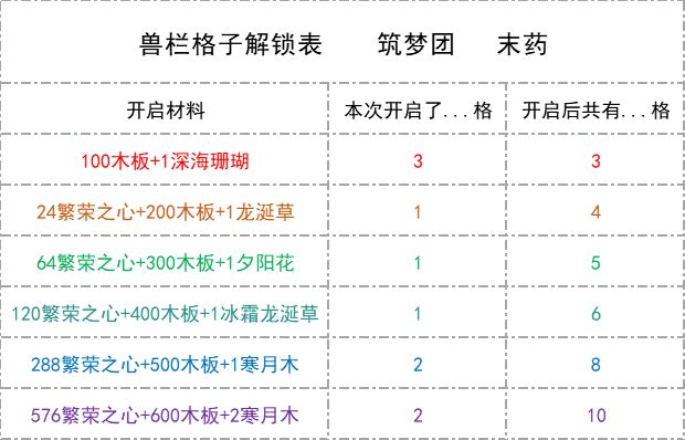 抓到动物之后,自然少不了传统的开格子环节。开启兽栏格子的消耗如下表所示。