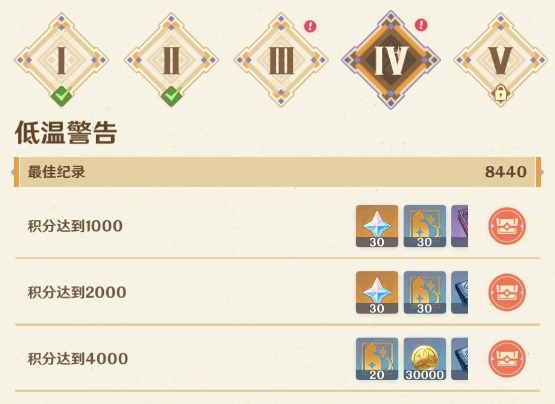 积分倍率选择10倍。本关先遣准备推荐水元素和冰元素角色,并且攻击次数非常重要,优先考虑选择丝柯克、神里绫华,另外像行秋、夜兰这样高频挂水的副C也很重要,能够频繁触发冻结反应。如果没有培养好的丝柯克最优阵容,可能很难将增益效果升到满级,因此可以考虑以Lv3为目标。