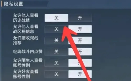 最后,我们在开启的账户安全界面中,选择并点击关闭允许他人查看战绩功能,来隐藏个人战绩和kd即可