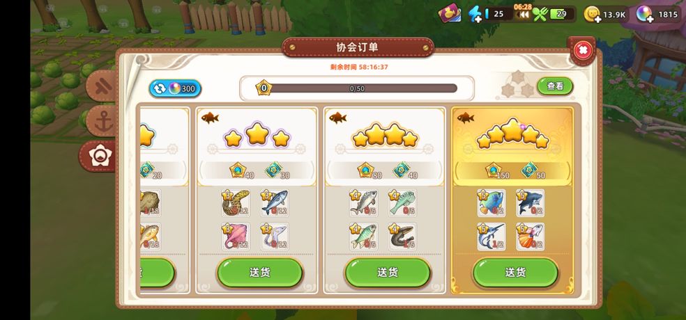 3、协会订单有分为钓鱼类(难度:中)、昆虫类(难度:难或中偏易)、潜水类(难度:难)协会订单,每个订单难易程度不同。