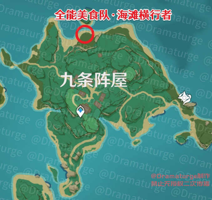 位置1:在离岛和绀田村中间的海滩,需要特殊的绯樱绣球,穿过若雷屏障拾取;