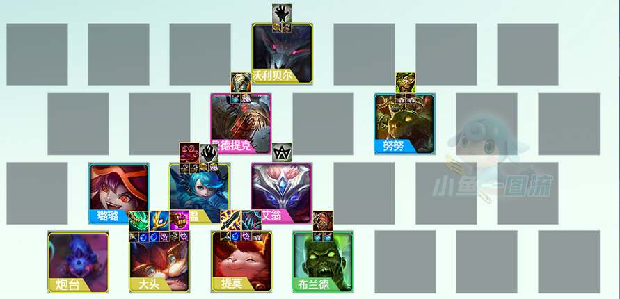1、阵容构成:璐璐+火男+艾翁+格温+大头+提莫+努努+狗熊+稻草人;