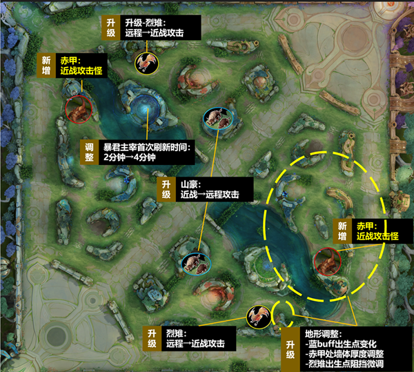由于鸟怪经常被边路给收取导致打野打完第一野怪无法到达4级,还有红色方发育路少了一只野怪的问题,所以把鸟怪由远程攻击改为近战攻击,但是同时也保留现在发育路可以获取到鸟怪点资源的可能性。