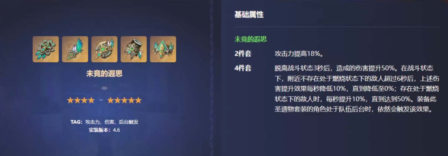 套装最优选择是【未竟的遐思】,2件套攻击力提高18%,4件套脱离战斗状态3秒后,造成的伤害提升50%。
