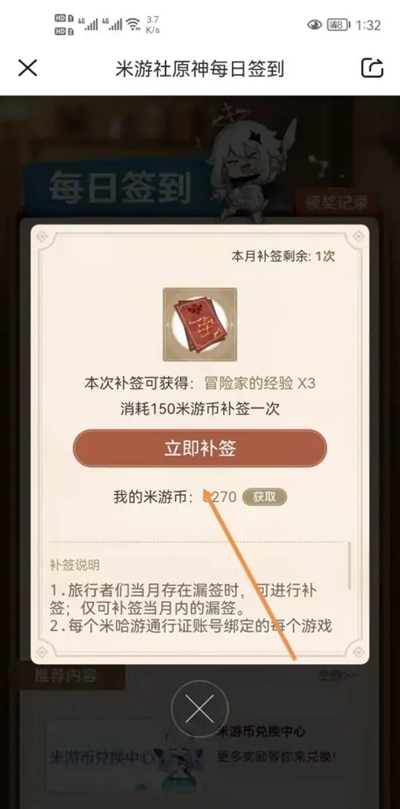 3、我们点击立即补签就可以使用150米游币进行补签了。
