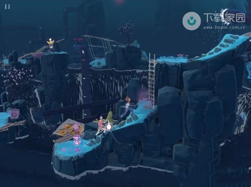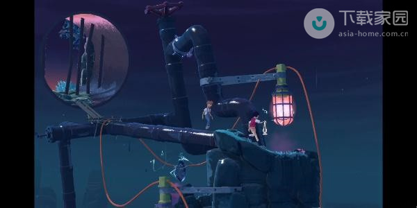 1、首先先让拿着灯笼的走下面,而另外一个则走上面,接着向前方走即可把光收入灯笼当中;