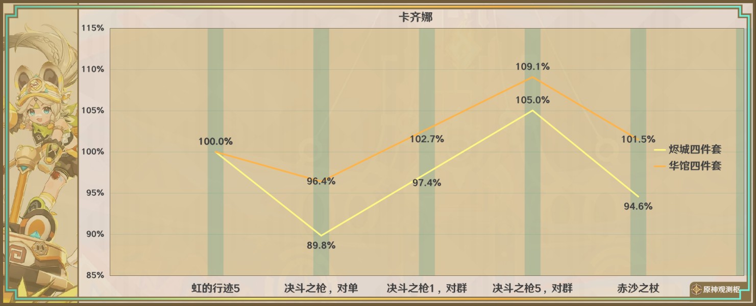 考虑稳定性与性价比时,精5虹的行迹是卡齐娜最优先的输出武器,只会较特定情况下的决斗之枪与赤沙之杖略差;由于卡齐娜提供的输出相对有限,队伍中有能量需求时也可以视队伍角色情况携带西风长枪(卡齐娜的技能机制不算很适合触发西风,西风长枪的输出大致为虹的行迹的70%)。