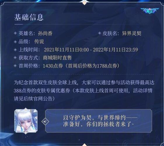 王者荣耀最近要上线一款孙尚香的皮肤,孙尚香新皮肤在设计上非常的美观,这款皮肤在之前的预告中很受玩家关注,那么下面为大家王者荣耀孙尚香异界灵契多少钱,一起来看看吧。