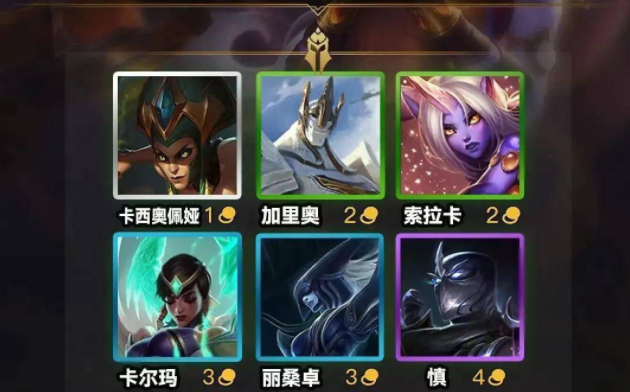 1、羁绊弈子:卡西奥佩娅,加里奥,索拉卡,卡尔玛,丽桑卓,慎