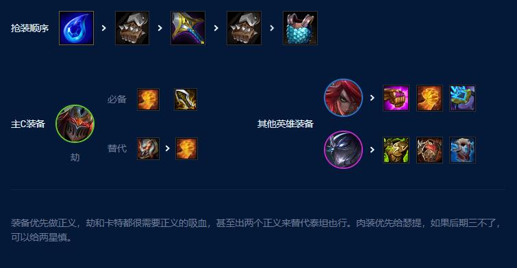 2、主C劫正义和无尽必备,第三件可以带泰坦;剩余法术装备可以给卡特离子、法爆、正义等。