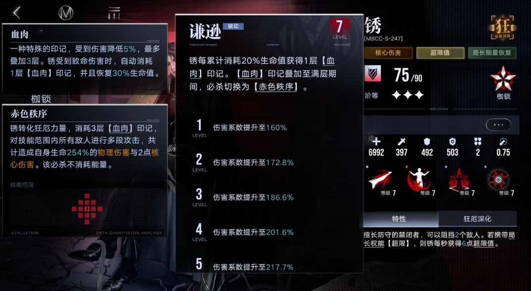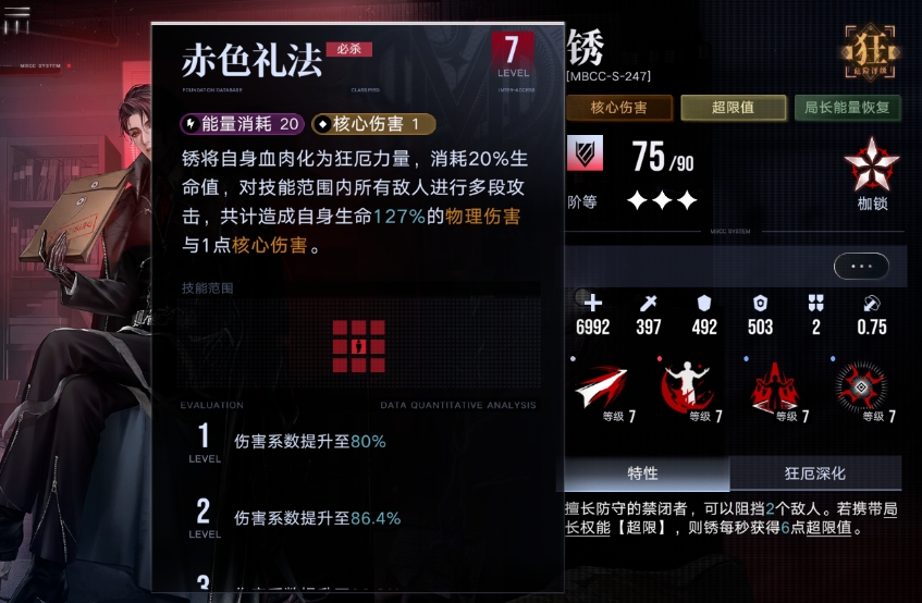 消耗所有局长能量,每消耗1点,使局长获得1层【深层狂厄】印记。友方禁闭者使用消耗局长能量的技能时,也会触发该效果,使局长获得对应层数的【深层狂厄】印记。局长能量上限增加5点。【深层狂厄】:友方禁闭者攻击提升2%,持续6秒,最多叠加10层。