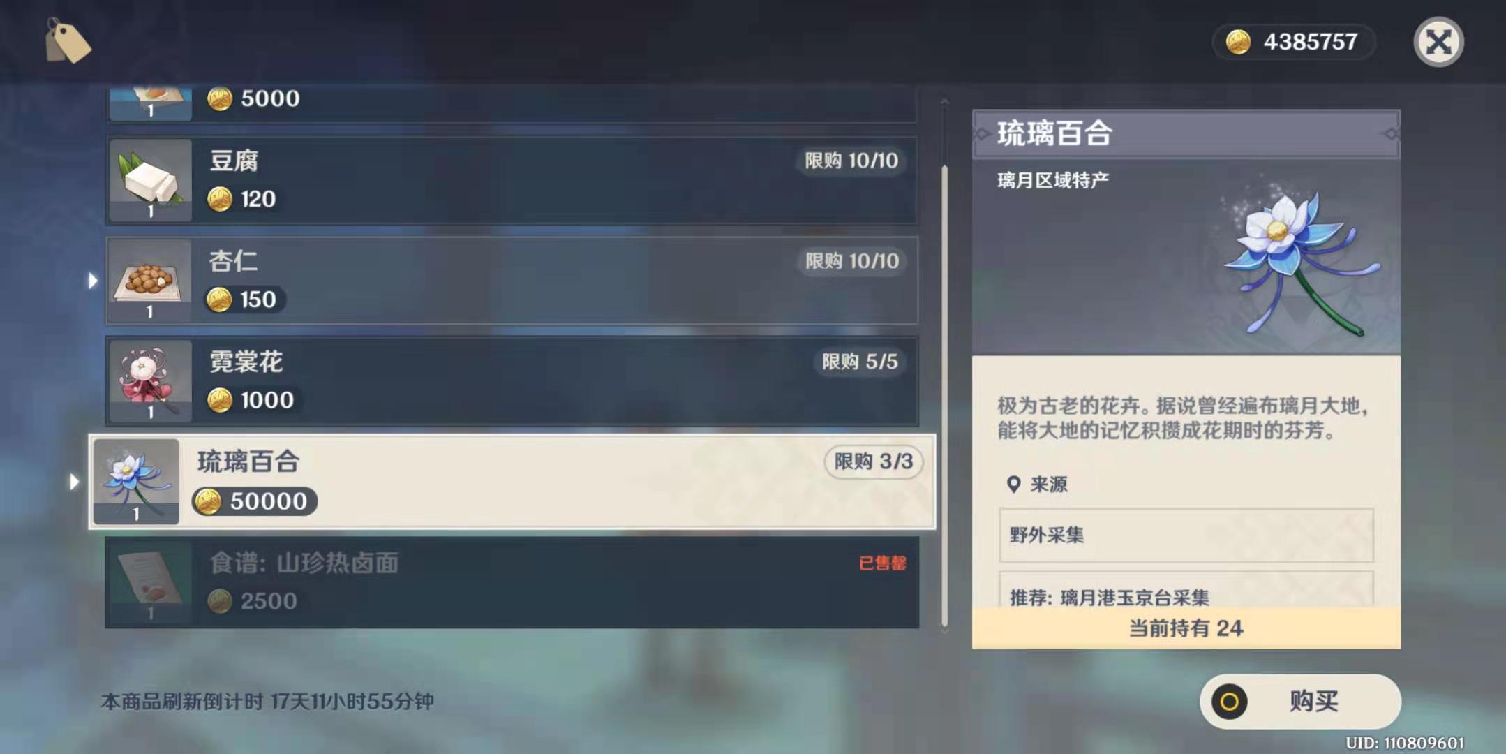 4、最后花费50000摩拉就能购买了,可以说非常黑,不建议大家购买,往前面一点,轻策庄的麦田i有很多琉璃百合。