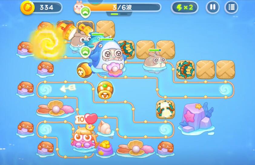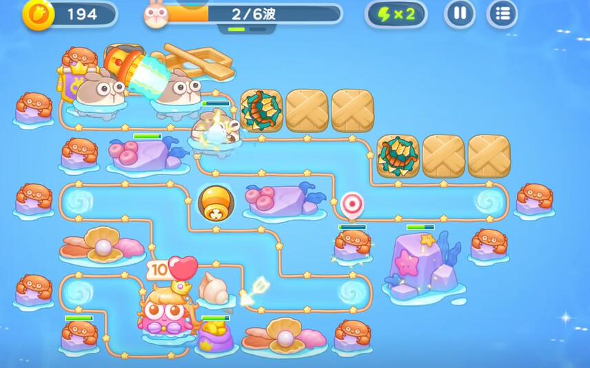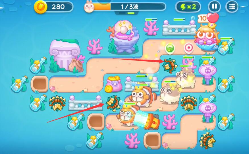 1、在如图所示的位置建造两个多重箭塔,搭配上第一轮的防御,对兔子和障碍物进行攻击。
